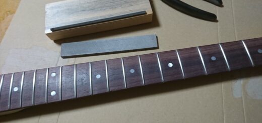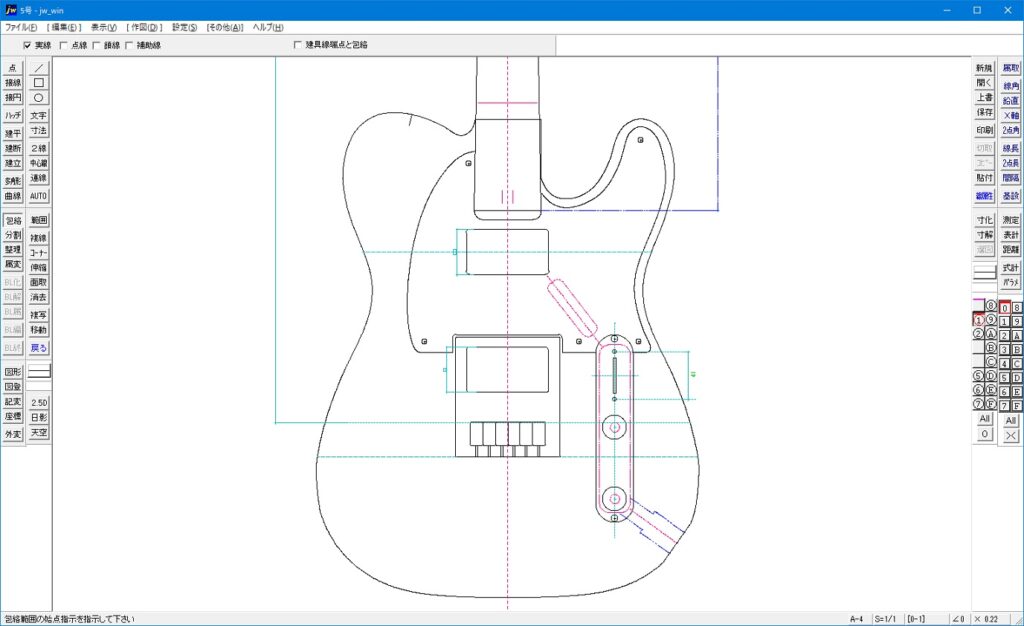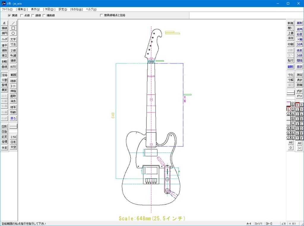図面の書き方は1本目、2本目と同じようにフレット位置を決めて、ブリッジ位置を決めたらボディシェイプを曲線ツールで描きこんでいきます。後は細かい部分を描き足していきます。各フレットの線に関しては、Stewmacさんで購入できるフレット溝カッターとテンプレートを利用するので図面の段階では省いてしまっています。また印刷後に張り合わせるための補助線と印刷ずれがないかを確認するための補助線がネックには書き込んであります。
