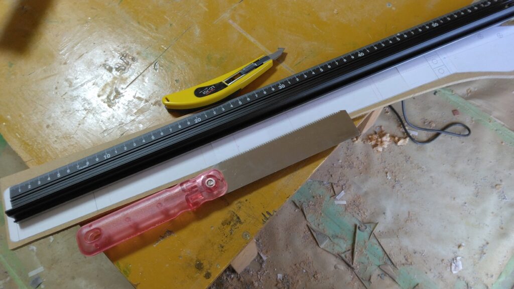 ネックの直線は定規とカッター、薄刃のノコを使って切り出していきます。